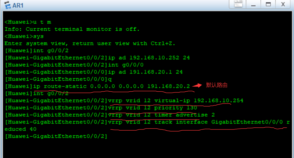 - 配置AR2路由器G0/0/1和G0/0/2接口的IP地址以及在接口0/0/2配置VRRP(如图)。