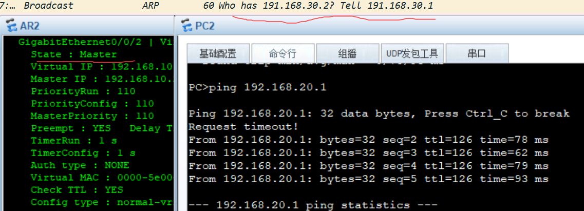 - PC2访问PC1数据包优先走主路由器AR1,此时AR1为Master,AR2为Backup。