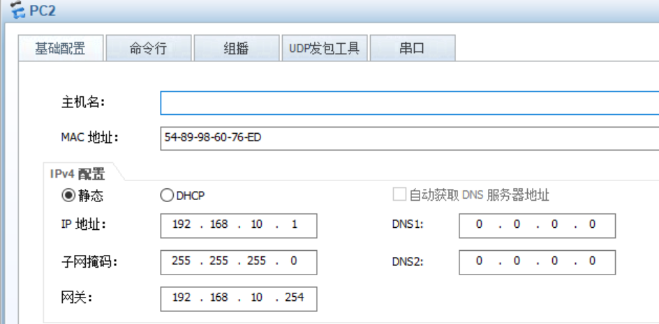 - PC2配置IP,192.168.10.1/24,pc1配置192.168.20.1/24(如图)。