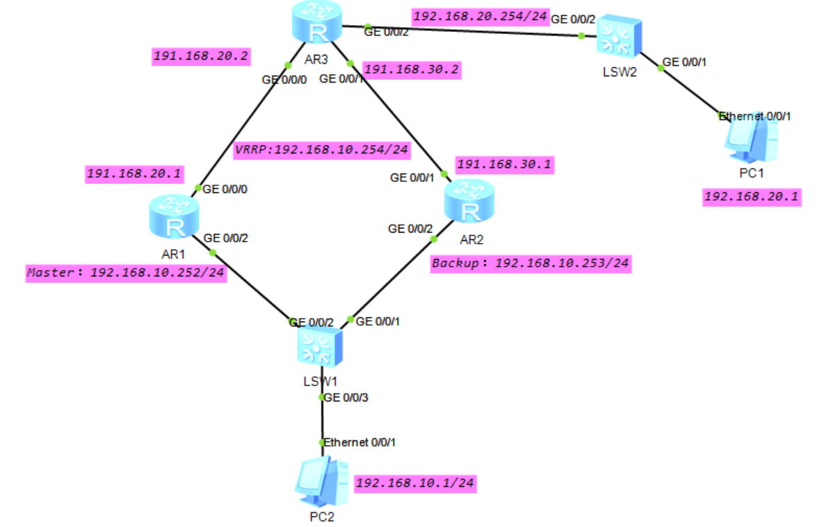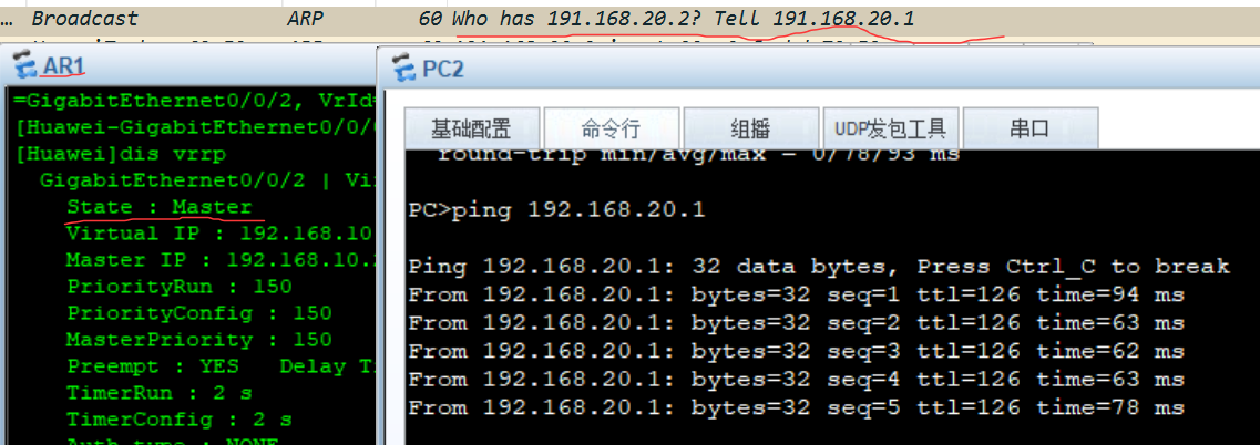 - PC2访问PC1数据包优先走主路由器AR1,此时AR1为Master,AR2为Backup。