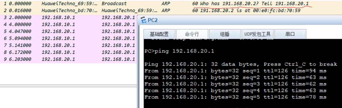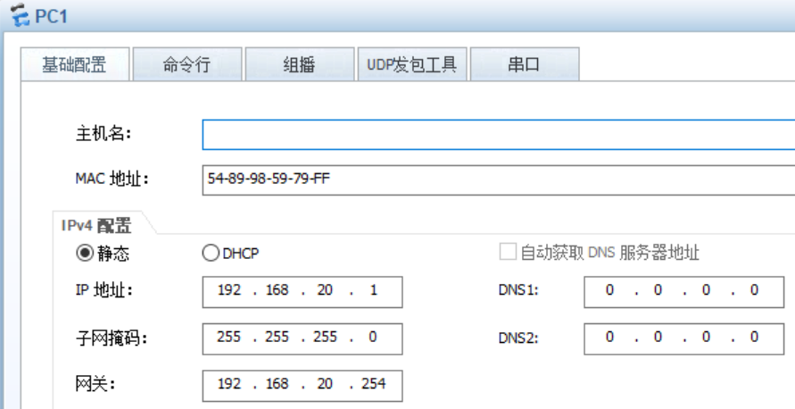 - PC2配置IP,192.168.10.1/24,pc1配置192.168.20.1/24(如图)。