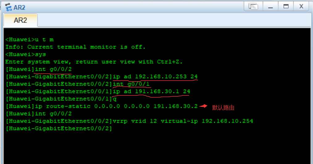 - 配置AR2路由器G0/0/1和G0/0/2接口的IP地址以及在接口0/0/2配置VRRP(如图)。