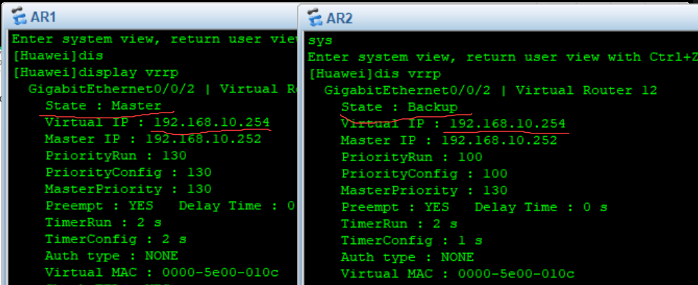 vrrp vrid 12 virtual-ip 192.168.10.254:设置虚拟路由器的IP地址(需要与AR1设置相同的VRRP虚拟IP地址)。
