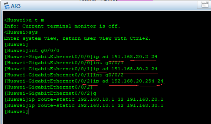 - 配置AR3路由器接口G0/0/0,G0/0/1 ,G0/0/2IP地址(如图)。