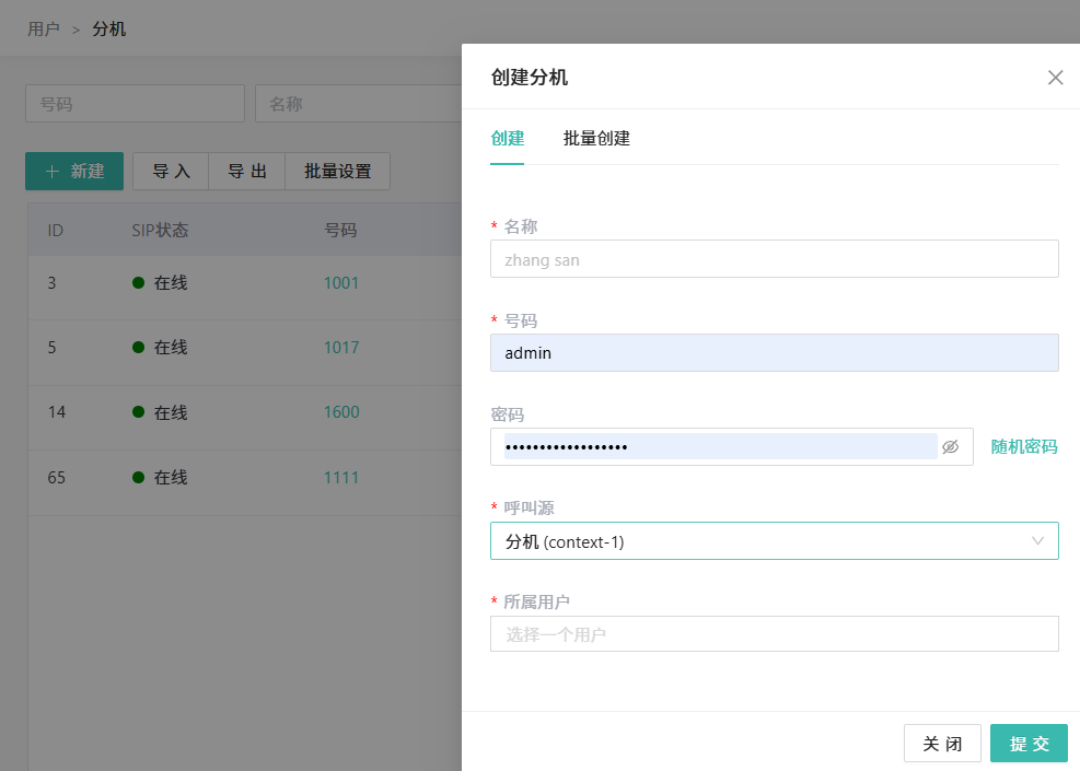 - 安装成功后创建分机账号,单个创建或者批量创建都可以。如图所示: