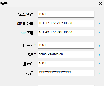 - 服务器:XSwitch 服务器的 IP 地址,或域名,如果端口号不是默认的
